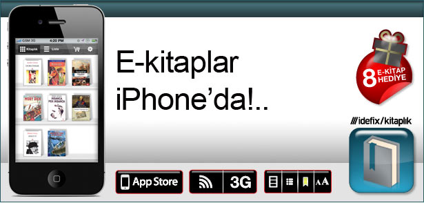 Idefix, bir güzellik olarak Iphone uygulamasını yükleyenlere 8 adet e-kitabı hediye ediyor. Bu kitaplar Nietzsche’den “İnsanca, Pek İnsanca”, Herman Melville’den “Moby Dick”, Jules Verne’den “Denizler Altında 20 Bin Fersah”, Ömer Seyfettin’den “Kaşağı”, “Tolstoy’un Gizli Raporlarında Osmanlı İmparatorluğu”, Erhan Afyoncu’dan “Osmanlı’nın Hayaleti”, Ahmet Celal’den “Dokunmak” ve Peride Celal’den “Mektup”. Uygulamayı beğendim, okunurluğu oldukça iyi, yeni sürümlerinde not alma, highlight etme gibi opsiyonları da sunacaklarını belirtiyorlar ki buna özellikle çok sevindim.